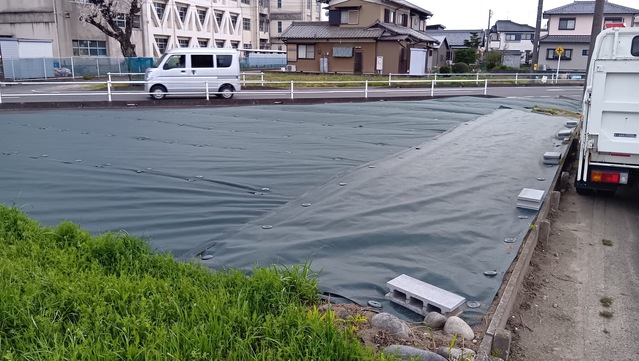 「強風で防草シートがめくれてしまう為、ブロックを置いて欲しい」とのご依頼。